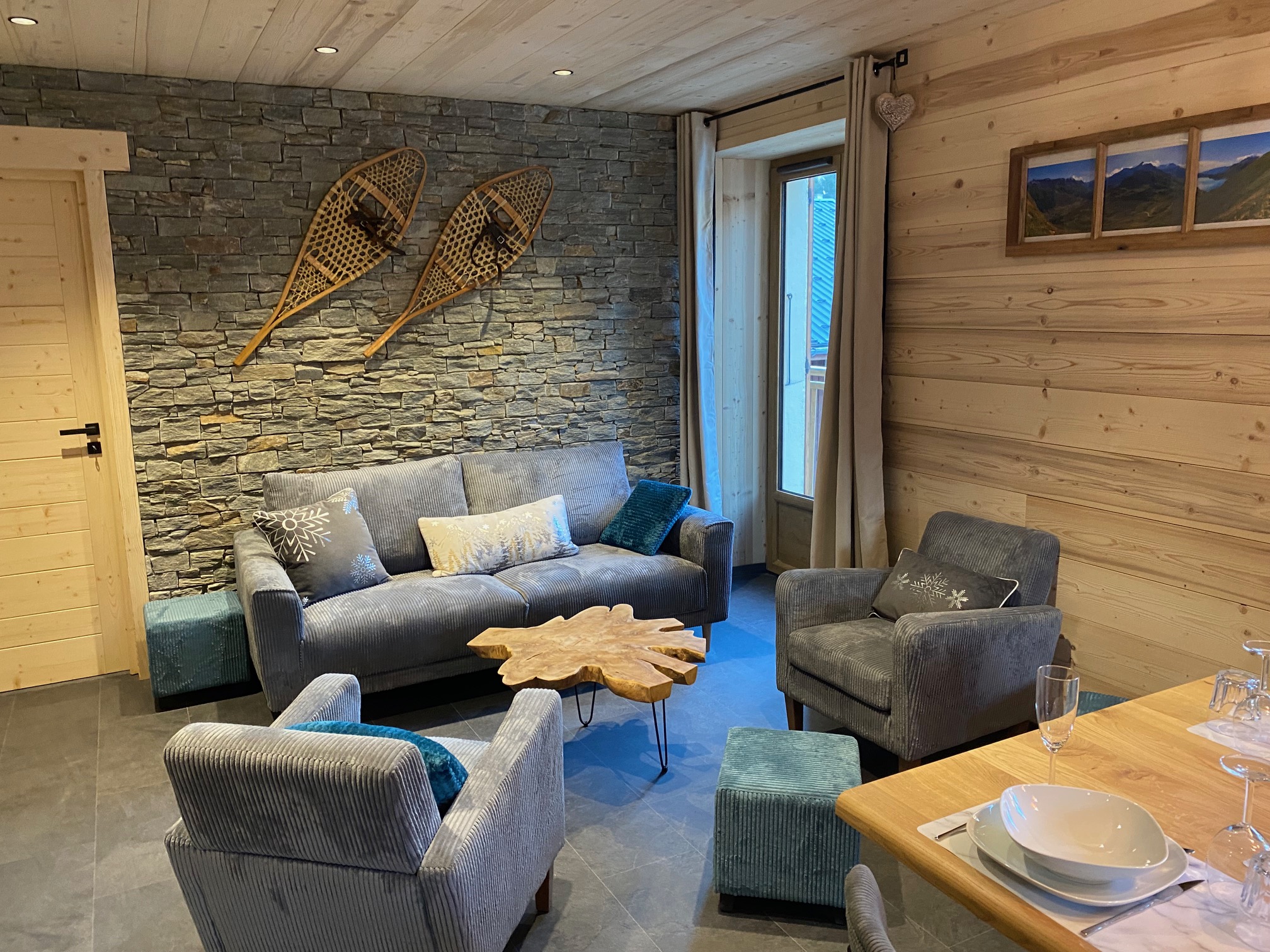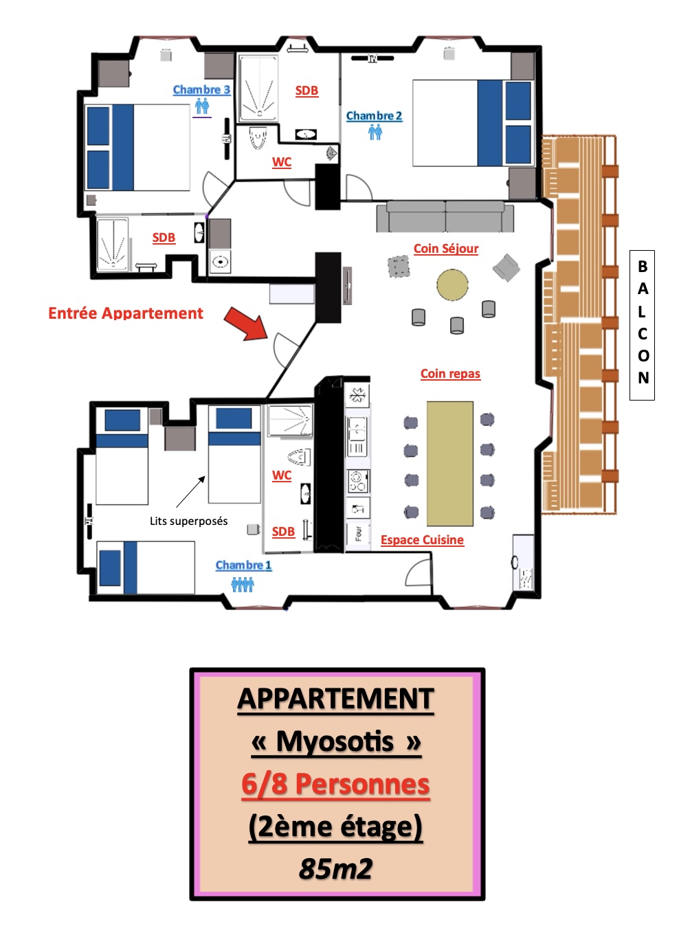 Cet appartement spacieux et lumineux de 85 m2 pour 8 personnes se situe dans un bâtiment sur la place du village, entre l’Office du Tourisme et la Boulangerie, face à l’Epicerie.